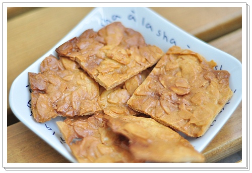 材料:1奶油30g 2糖35g 3全蛋65g 4低筋麵粉30g 5.杏仁片100g